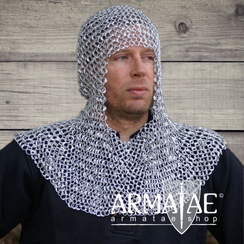 Kettenhaube gefertigt aus vernieteten Aluminium-Rundringen mit einem ID von 10 mm.