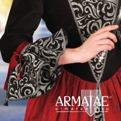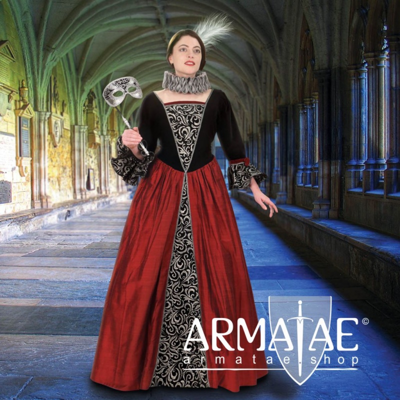 Vollends dem südeuropäischen Feuer verschriebenes Prunk-Kleid einer machterfahrenen Frau der obersten Schicht mit wunderschönen Volant-Ärmel. Eine Inspiration & Symbiose entnommen der Commedia dell´ arte aus Taft & Samt in Schwarz & Silber, akzentreich und dennoch harmonisch alternierend mit der anregenden Farbe Rot. Überlegen und zugleich sanft anmutend. Die Rückenschnürung sowie zwei weitere dekorative Bänder unterhalb der Schnürung sorgen für einen perfekten und angenehmen Sitz dieses beeindruckendes Kleides der bestimmenden Herrscherschicht.