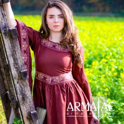 Ein sehr edles Viskose-Kleid mit geschnürtem Rücken, weiten Trompetenärmel und harmonischen Bordüren am hohen Ausschnitt, Hüfte und Ärmel.