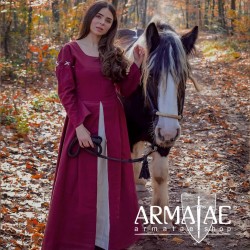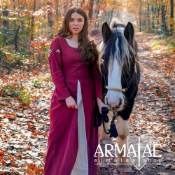Sehr gelungenes, mittelalterlich authentisches Kleid mit per Schnürung abnehmbarer Ärmel, im Rockbereich aus zwei Lagen robustem Baumwollstoff gefertigt, welcher traditionell pflanzlich gefärbt wurde.
