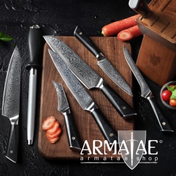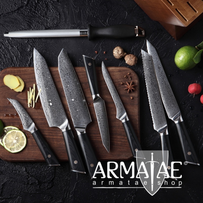 Diese High-End-Küchenmesser mit Klingen aus 67 Lagen rostfreiem Messerstahl gleiten mit ihrer rasiermesserscharfen Klinge mühelos durch jedes Schneidgut.
