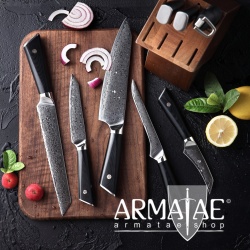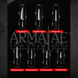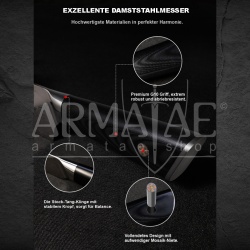 Diese rostfreien, vakuum-gehärteten Rosendamast-Klingen besitzen gegenüber z.B. professionellen, geschmiedeten CrMoV15 Klingen eine mindestens 2,5x höhere Standzeit der Schneide.