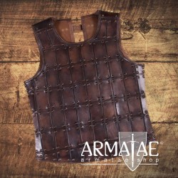 Sehr robuste und äußerst gelungene und stabile Oberkörper Panzerung aus stabilem hochwertigen Leder, vegetabil gegerbt. Die gesamte Vorderseite ist bis über die Schultern mit rechteckigen Lederflecken aufgedoppelt, welche jeweils mit vier Antik-Messing-Nieten appliziert sind.