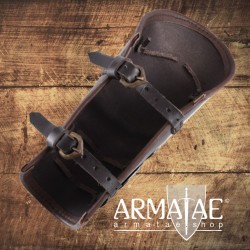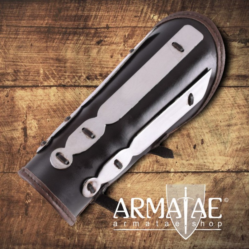 Ein Stück extrem robuster, handgefertigter Unterarm-Schutz, perfekt für den Schaukampf, aus dickem ca. 5 mm starkem Leder mit 3 Stück ca. 2 mm starken Stahlschienen. Die Ränder sind umlaufend eingefasst vernäht. Für die individuelle Größenanpassung sind 2 starke Riemen mit Schnallen aus massivem Messing aufgenäht.