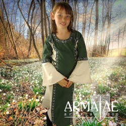 Aufwendig und hochwertig gearbeitetes Prinzessinnenkleid aus reiner Baumwolle mit weiten Ärmeln in Glockenform. Das Kleid ist 2-fach über die gesamte Vorderseite, an den Armen und am Dekolletee mit farblich abgestimmten und mittelalterlich anmutenden Bordüren besetzt.