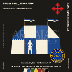 Das Mehrwert-2-Mast-Zelt-Set Leonhard-plus bekommst du in 30 Farbkombinationen. Dieses universelle Ritterzelt ist ideal für LARP, Glamping und den Dauereinsatz. Dank rechteckiger Form nutzt man den Platz darin perfekt.