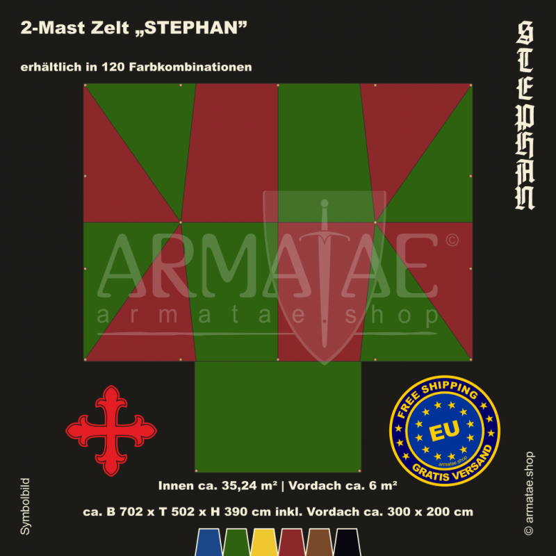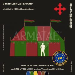 Das Mehrwert-Ritterzelt-Set Stephan-plus bekommst du in 120 Farbkombinationen. Dieses universelle Ritterzelt ist ideal für LARP, Glamping und den Dauereinsatz. Dank rechteckiger Form nutzt man den Platz darin perfekt.