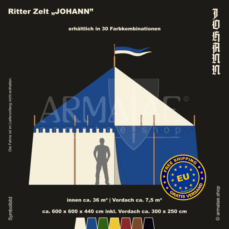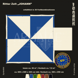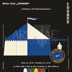 Das universelle Ritterzelt-Set Johann bekommst du in 30 Farbkombinationen, ideal fĂĽr Ritter & Landsknecht. Dank quadratischer Form nutzt man den Platz darin perfekt.