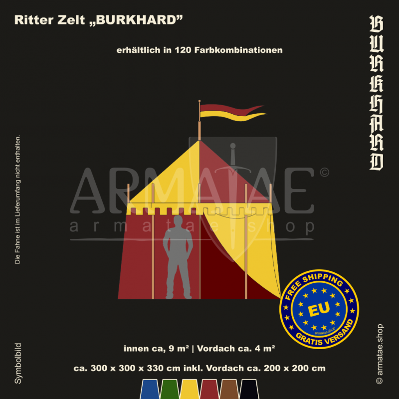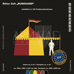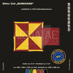 Das universelle Ritterzelt-Set Burkhard bekommst du in 120 Farbkombinationen, ideal fĂĽr Ritter & Landsknecht. Dank quadratischer Form nutzt man den Platz darin perfekt.