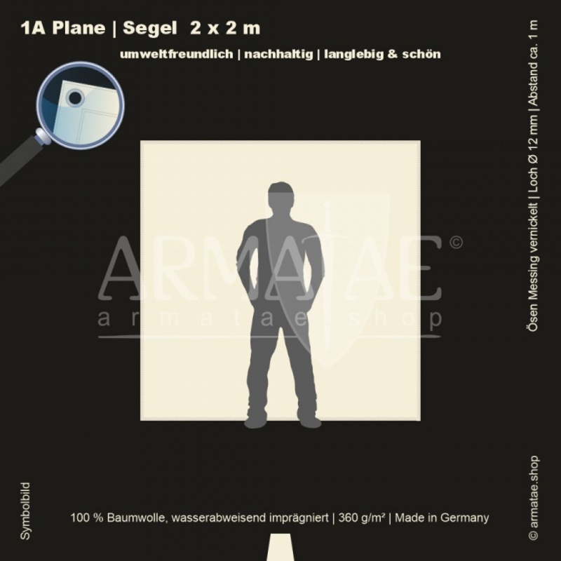 Schwere Sonnenschutz & Regenschutz Plane aus wasserabweisend imprägniertem 100 % Baumwollgewebe mit 360g/m². Für unzählige Einsatzbereiche, ob mobil oder für den Dauereinsatz fest montiert. Umlaufend gesäumt und mit rostfreien Ösen aus vernickeltem Messing mit einem Innendurchmesser von 12 mm im Abstand von 1 m von Hand gefertigt. 5 Jahre Garantie auf die äußerst robuste Verarbeitung.