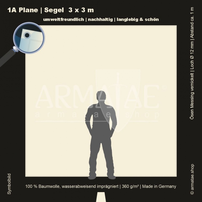 Schwere Sonnenschutz & Regenschutz Plane aus wasserabweisend imprägniertem 100 % Baumwollgewebe mit 360g/m². Für unzählige Einsatzbereiche, ob mobil oder für den Dauereinsatz fest montiert. Umlaufend gesäumt und mit rostfreien Ösen aus vernickeltem Messing mit einem Innendurchmesser von 12 mm im Abstand von 1 m von Hand gefertigt. 5 Jahre Garantie auf die äußerst robuste Verarbeitung.