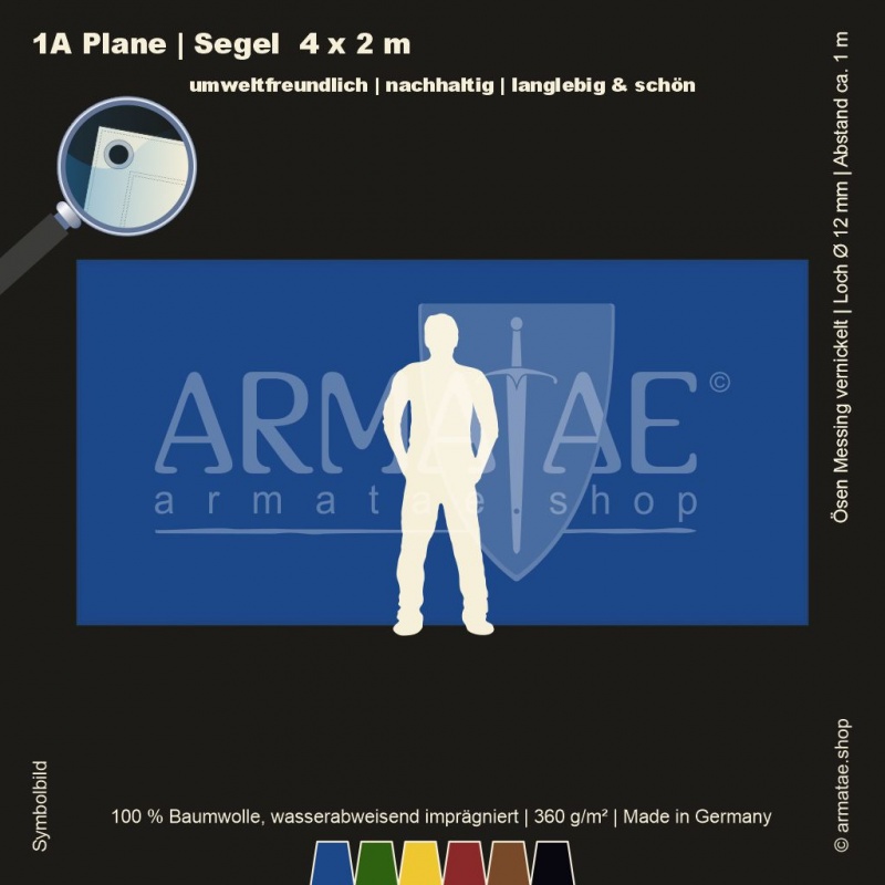Schwere Sonnenschutz & Regenschutz Plane aus wasserabweisend imprägniertem 100 % Baumwollgewebe mit 360g/m². Für unzählige Einsatzbereiche, ob mobil oder für den Dauereinsatz fest montiert. Umlaufend gesäumt und mit rostfreien Ösen aus vernickeltem Messing mit einem Innendurchmesser von 12 mm im Abstand von 1 m von Hand gefertigt. 5 Jahre Garantie auf die äußerst robuste Verarbeitung.