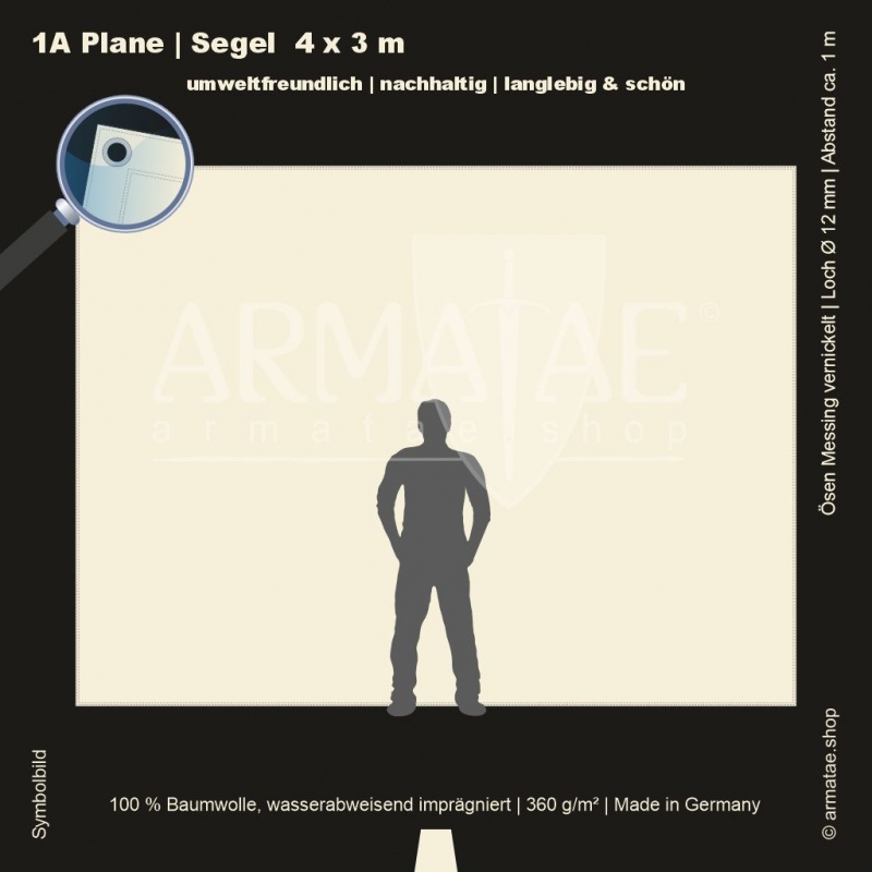 Schwere Sonnenschutz & Regenschutz Plane aus wasserabweisend imprägniertem 100 % Baumwollgewebe mit 360g/m². Für unzählige Einsatzbereiche, ob mobil oder für den Dauereinsatz fest montiert. Umlaufend gesäumt und mit rostfreien Ösen aus vernickeltem Messing mit einem Innendurchmesser von 12 mm im Abstand von 1 m von Hand gefertigt. 5 Jahre Garantie auf die äußerst robuste Verarbeitung.