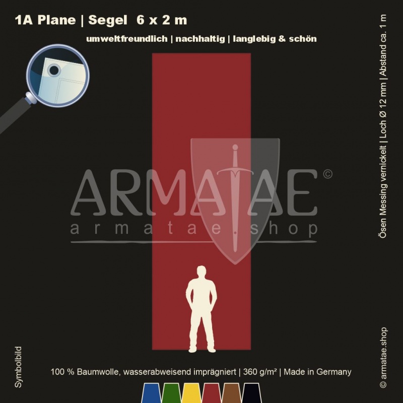 Schwere Sonnenschutz & Regenschutz Plane aus wasserabweisend imprägniertem 100 % Baumwollgewebe mit 360g/m². Für unzählige Einsatzbereiche, ob mobil oder für den Dauereinsatz fest montiert. Umlaufend gesäumt und mit rostfreien Ösen aus vernickeltem Messing mit einem Innendurchmesser von 12 mm im Abstand von 1 m von Hand gefertigt. 5 Jahre Garantie auf die äußerst robuste Verarbeitung.