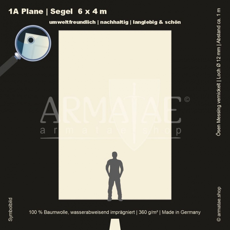 Schwere Sonnenschutz & Regenschutz Plane aus wasserabweisend imprägniertem 100 % Baumwollgewebe mit 360g/m². Für unzählige Einsatzbereiche, ob mobil oder für den Dauereinsatz fest montiert. Umlaufend gesäumt und mit rostfreien Ösen aus vernickeltem Messing mit einem Innendurchmesser von 12 mm im Abstand von 1 m von Hand gefertigt. 5 Jahre Garantie auf die äußerst robuste Verarbeitung.