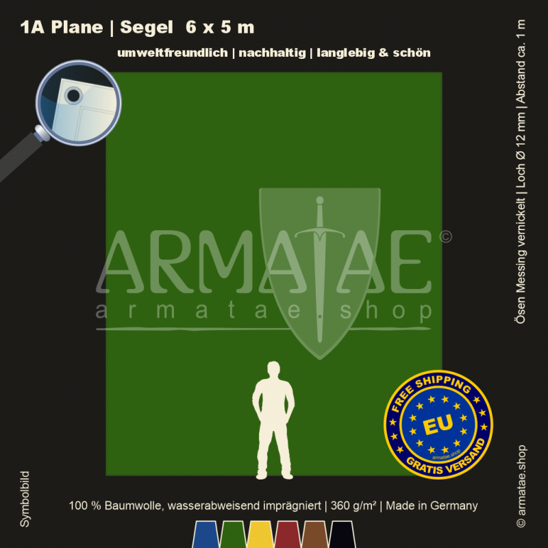Schwere Sonnenschutz & Regenschutz Plane aus wasserabweisend imprägniertem 100 % Baumwollgewebe mit 360g/m². Für unzählige Einsatzbereiche, ob mobil oder für den Dauereinsatz fest montiert. Umlaufend gesäumt und mit rostfreien Ösen aus vernickeltem Messing mit einem Innendurchmesser von 12 mm im Abstand von 1 m von Hand gefertigt. 5 Jahre Garantie auf die äußerst robuste Verarbeitung.