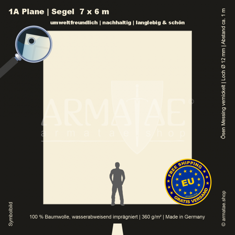 Schwere Sonnenschutz & Regenschutz Plane aus wasserabweisend imprägniertem 100 % Baumwollgewebe mit 360g/m². Für unzählige Einsatzbereiche, ob mobil oder für den Dauereinsatz fest montiert. Umlaufend gesäumt und mit rostfreien Ösen aus vernickeltem Messing mit einem Innendurchmesser von 12 mm im Abstand von 1 m von Hand gefertigt. 5 Jahre Garantie auf die äußerst robuste Verarbeitung.