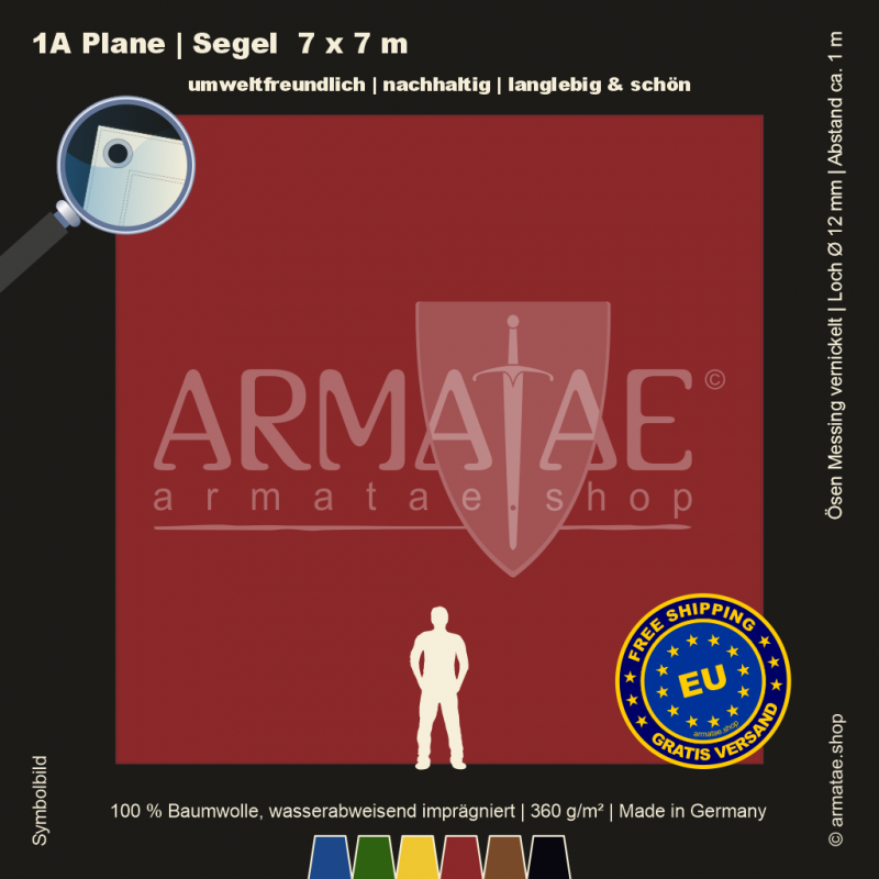 Schwere Sonnenschutz & Regenschutz Plane aus wasserabweisend imprägniertem 100 % Baumwollgewebe mit 360g/m². Für unzählige Einsatzbereiche, ob mobil oder für den Dauereinsatz fest montiert. Umlaufend gesäumt und mit rostfreien Ösen aus vernickeltem Messing mit einem Innendurchmesser von 12 mm im Abstand von 1 m von Hand gefertigt. 5 Jahre Garantie auf die äußerst robuste Verarbeitung.