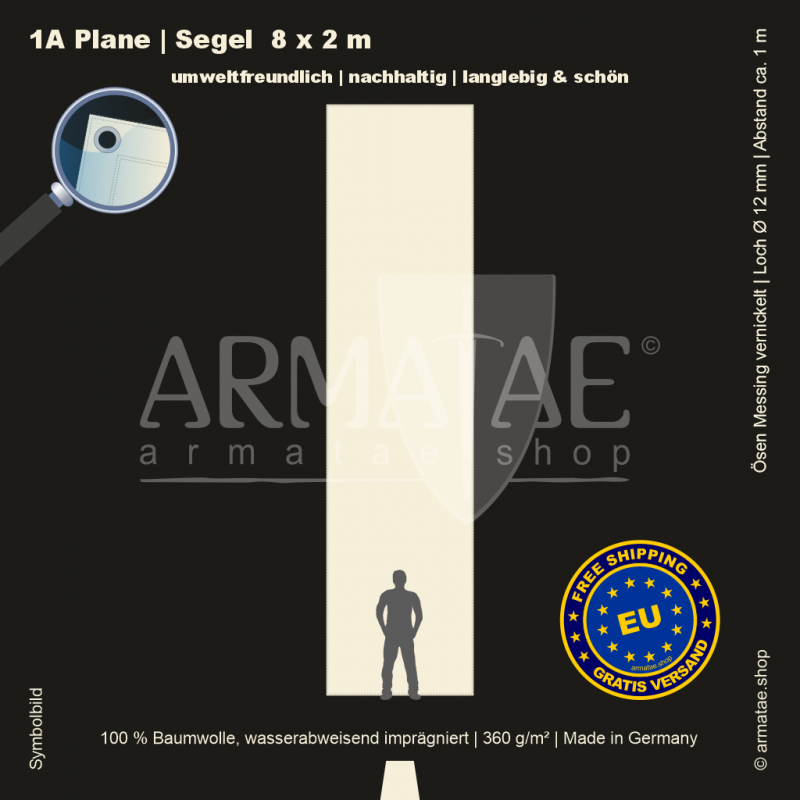 Schwere Sonnenschutz & Regenschutz Plane aus wasserabweisend imprägniertem 100 % Baumwollgewebe mit 360g/m². Für unzählige Einsatzbereiche, ob mobil oder für den Dauereinsatz fest montiert. Umlaufend gesäumt und mit rostfreien Ösen aus vernickeltem Messing mit einem Innendurchmesser von 12 mm im Abstand von 1 m von Hand gefertigt. 5 Jahre Garantie auf die äußerst robuste Verarbeitung.