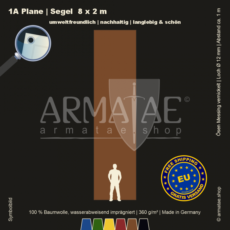 Schwere Sonnenschutz & Regenschutz Plane aus wasserabweisend imprägniertem 100 % Baumwollgewebe mit 360g/m². Für unzählige Einsatzbereiche, ob mobil oder für den Dauereinsatz fest montiert. Umlaufend gesäumt und mit rostfreien Ösen aus vernickeltem Messing mit einem Innendurchmesser von 12 mm im Abstand von 1 m von Hand gefertigt. 5 Jahre Garantie auf die äußerst robuste Verarbeitung.