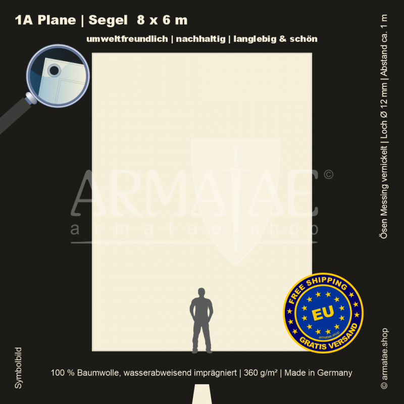 Schwere Sonnenschutz & Regenschutz Plane aus wasserabweisend imprägniertem 100 % Baumwollgewebe mit 360g/m². Für unzählige Einsatzbereiche, ob mobil oder für den Dauereinsatz fest montiert. Umlaufend gesäumt und mit rostfreien Ösen aus vernickeltem Messing mit einem Innendurchmesser von 12 mm im Abstand von 1 m von Hand gefertigt. 5 Jahre Garantie auf die äußerst robuste Verarbeitung.
