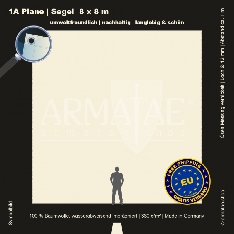 Schwere Sonnenschutz & Regenschutz Plane aus wasserabweisend imprägniertem 100 % Baumwollgewebe mit 360g/m². Für unzählige Einsatzbereiche, ob mobil oder für den Dauereinsatz fest montiert. Umlaufend gesäumt und mit rostfreien Ösen aus vernickeltem Messing mit einem Innendurchmesser von 12 mm im Abstand von 1 m von Hand gefertigt. 5 Jahre Garantie auf die äußerst robuste Verarbeitung.