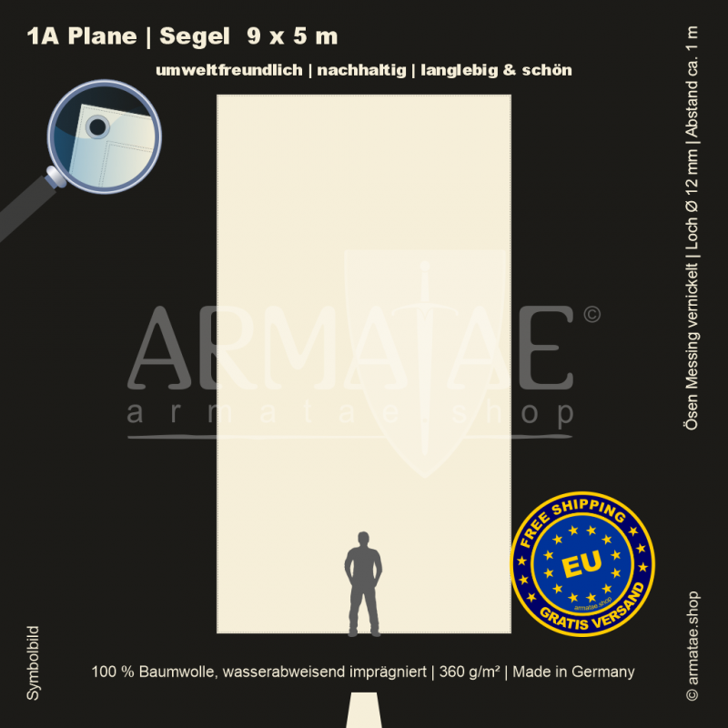 Schwere Sonnenschutz & Regenschutz Plane aus wasserabweisend imprägniertem 100 % Baumwollgewebe mit 360g/m². Für unzählige Einsatzbereiche, ob mobil oder für den Dauereinsatz fest montiert. Umlaufend gesäumt und mit rostfreien Ösen aus vernickeltem Messing mit einem Innendurchmesser von 12 mm im Abstand von 1 m von Hand gefertigt. 5 Jahre Garantie auf die äußerst robuste Verarbeitung.