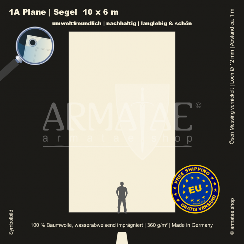 Schwere Sonnenschutz & Regenschutz Plane aus wasserabweisend imprägniertem 100 % Baumwollgewebe mit 360g/m². Für unzählige Einsatzbereiche, ob mobil oder für den Dauereinsatz fest montiert. Umlaufend gesäumt und mit rostfreien Ösen aus vernickeltem Messing mit einem Innendurchmesser von 12 mm im Abstand von 1 m von Hand gefertigt. 5 Jahre Garantie auf die äußerst robuste Verarbeitung.