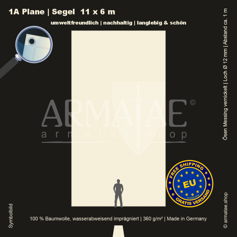 Schwere Sonnenschutz & Regenschutz Plane aus wasserabweisend imprägniertem 100 % Baumwollgewebe mit 360g/m². Für unzählige Einsatzbereiche, ob mobil oder für den Dauereinsatz fest montiert. Umlaufend gesäumt und mit rostfreien Ösen aus vernickeltem Messing mit einem Innendurchmesser von 12 mm im Abstand von 1 m von Hand gefertigt. 5 Jahre Garantie auf die äußerst robuste Verarbeitung.