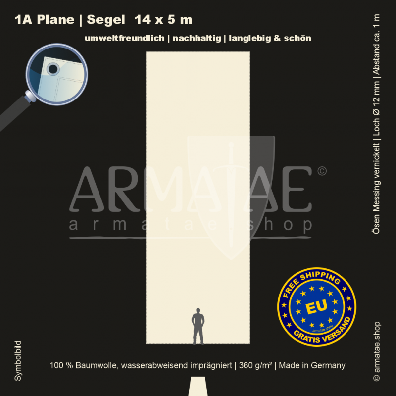 Schwere Sonnenschutz & Regenschutz Plane aus wasserabweisend imprägniertem 100 % Baumwollgewebe mit 360g/m². Für unzählige Einsatzbereiche, ob mobil oder für den Dauereinsatz fest montiert. Umlaufend gesäumt und mit rostfreien Ösen aus vernickeltem Messing mit einem Innendurchmesser von 12 mm im Abstand von 1 m von Hand gefertigt. 5 Jahre Garantie auf die äußerst robuste Verarbeitung.