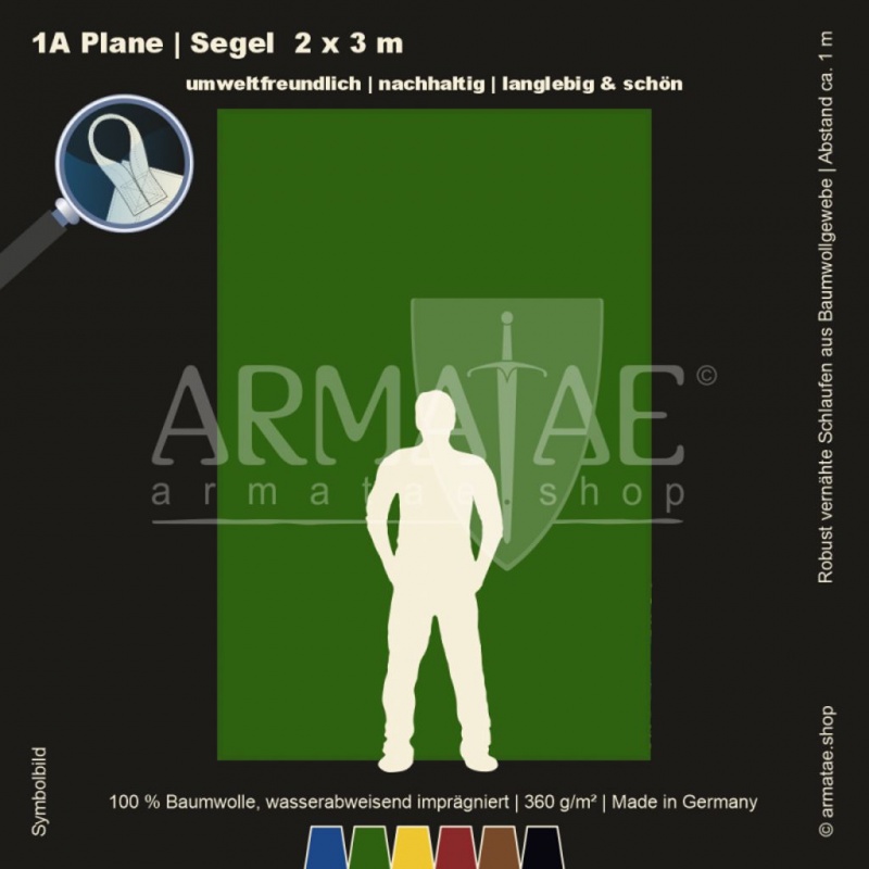 Schwere Sonnenschutz & Regenschutz Plane aus wasserabweisend imprägniertem 100 % Baumwollgewebe mit 360g/m². Für unzählige Einsatzbereiche, ob mobil oder für den Dauereinsatz fest montiert. Umlaufend gesäumt und mit Schlaufen aus Planenmaterial im Abstand von 1 m von Hand gefertigt. 5 Jahre Garantie auf die äußerst robuste Verarbeitung.