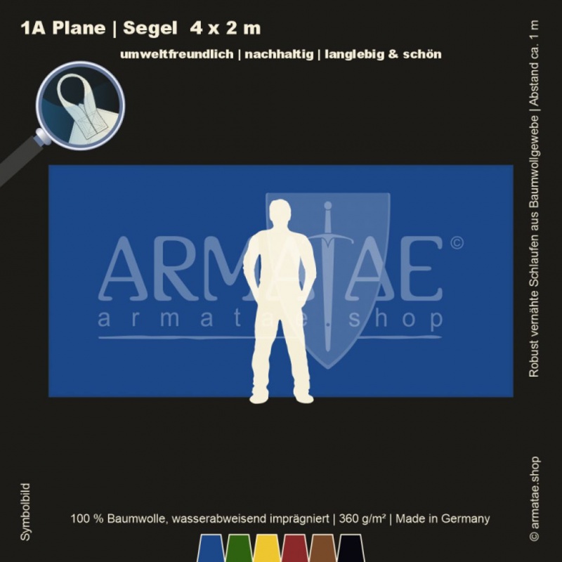 Schwere Sonnenschutz & Regenschutz Plane aus wasserabweisend imprägniertem 100 % Baumwollgewebe mit 360g/m². Für unzählige Einsatzbereiche, ob mobil oder für den Dauereinsatz fest montiert. Umlaufend gesäumt und mit Schlaufen aus Planenmaterial im Abstand von 1 m von Hand gefertigt. 5 Jahre Garantie auf die äußerst robuste Verarbeitung.