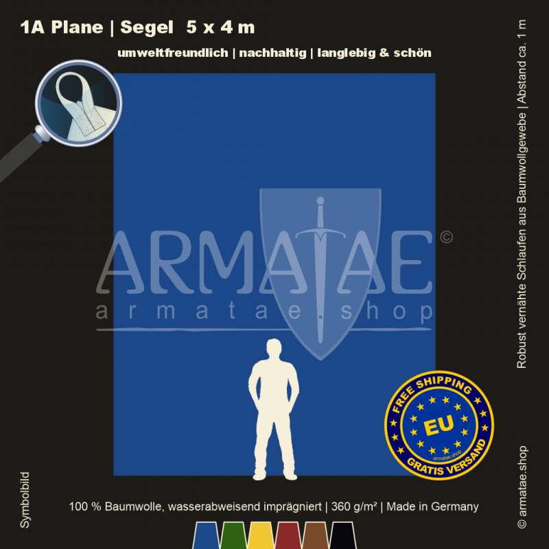 Schwere Sonnenschutz & Regenschutz Plane aus wasserabweisend imprägniertem 100 % Baumwollgewebe mit 360g/m². Für unzählige Einsatzbereiche, ob mobil oder für den Dauereinsatz fest montiert. Umlaufend gesäumt und mit Schlaufen aus Planenmaterial im Abstand von 1 m von Hand gefertigt. 5 Jahre Garantie auf die äußerst robuste Verarbeitung.