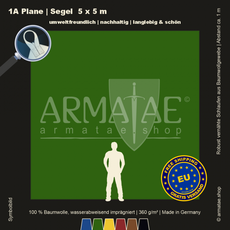 Schwere Sonnenschutz & Regenschutz Plane aus wasserabweisend imprägniertem 100 % Baumwollgewebe mit 360g/m². Für unzählige Einsatzbereiche, ob mobil oder für den Dauereinsatz fest montiert. Umlaufend gesäumt und mit Schlaufen aus Planenmaterial im Abstand von 1 m von Hand gefertigt. 5 Jahre Garantie auf die äußerst robuste Verarbeitung.