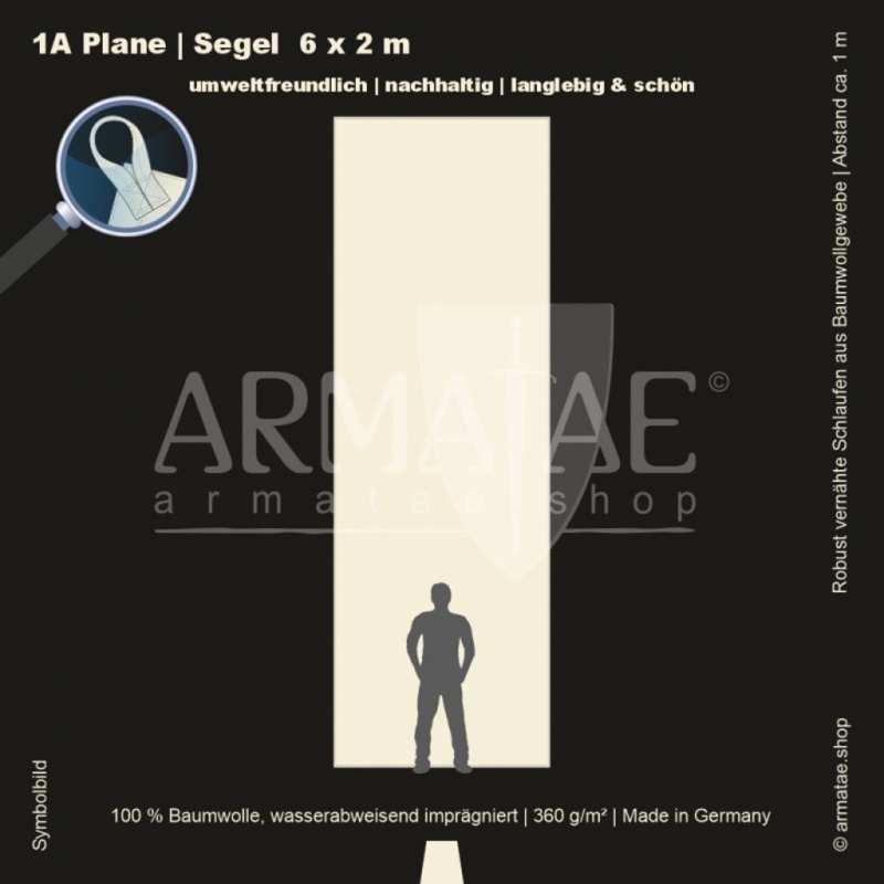 Schwere Sonnenschutz & Regenschutz Plane aus wasserabweisend imprägniertem 100 % Baumwollgewebe mit 360g/m². Für unzählige Einsatzbereiche, ob mobil oder für den Dauereinsatz fest montiert. Umlaufend gesäumt und mit Schlaufen aus Planenmaterial im Abstand von 1 m von Hand gefertigt. 5 Jahre Garantie auf die äußerst robuste Verarbeitung.