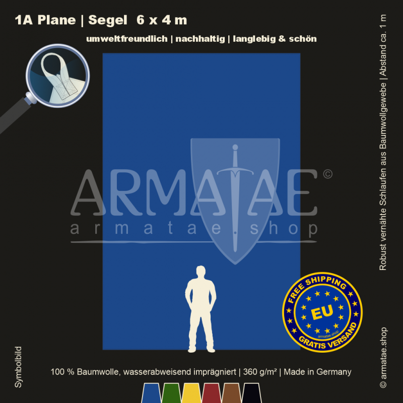 Schwere Sonnenschutz & Regenschutz Plane aus wasserabweisend imprägniertem 100 % Baumwollgewebe mit 360g/m². Für unzählige Einsatzbereiche, ob mobil oder für den Dauereinsatz fest montiert. Umlaufend gesäumt und mit Schlaufen aus Planenmaterial im Abstand von 1 m von Hand gefertigt. 5 Jahre Garantie auf die äußerst robuste Verarbeitung.