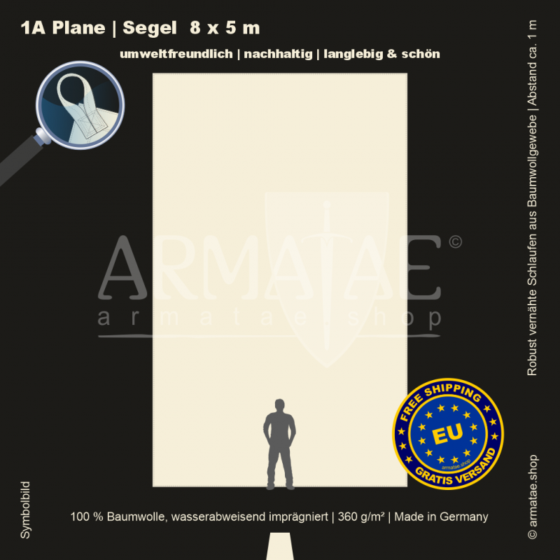 Schwere Sonnenschutz & Regenschutz Plane aus wasserabweisend imprägniertem 100 % Baumwollgewebe mit 360g/m². Für unzählige Einsatzbereiche, ob mobil oder für den Dauereinsatz fest montiert. Umlaufend gesäumt und mit Schlaufen aus Planenmaterial im Abstand von 1 m von Hand gefertigt. 5 Jahre Garantie auf die äußerst robuste Verarbeitung.