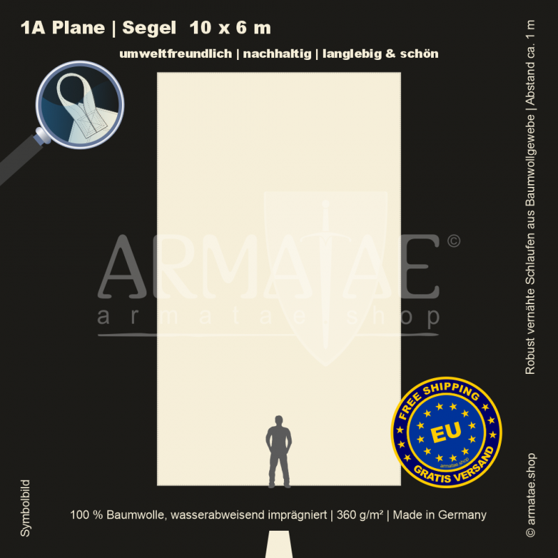 Schwere Sonnenschutz & Regenschutz Plane aus wasserabweisend imprägniertem 100 % Baumwollgewebe mit 360g/m². Für unzählige Einsatzbereiche, ob mobil oder für den Dauereinsatz fest montiert. Umlaufend gesäumt und mit Schlaufen aus Planenmaterial im Abstand von 1 m von Hand gefertigt. 5 Jahre Garantie auf die äußerst robuste Verarbeitung.