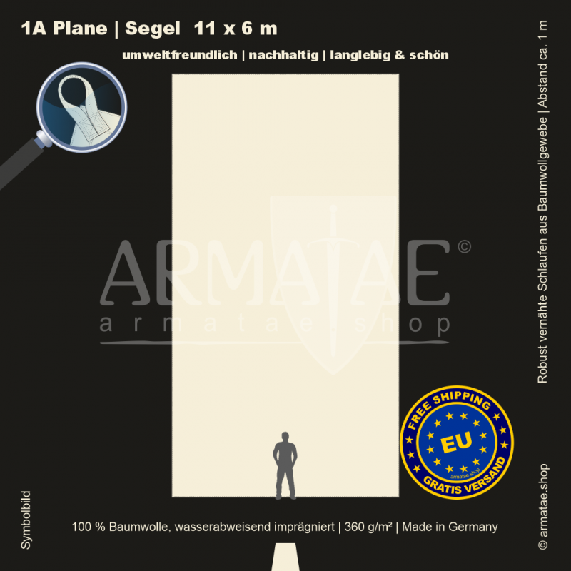 Schwere Sonnenschutz & Regenschutz Plane aus wasserabweisend imprägniertem 100 % Baumwollgewebe mit 360g/m². Für unzählige Einsatzbereiche, ob mobil oder für den Dauereinsatz fest montiert. Umlaufend gesäumt und mit Schlaufen aus Planenmaterial im Abstand von 1 m von Hand gefertigt. 5 Jahre Garantie auf die äußerst robuste Verarbeitung.
