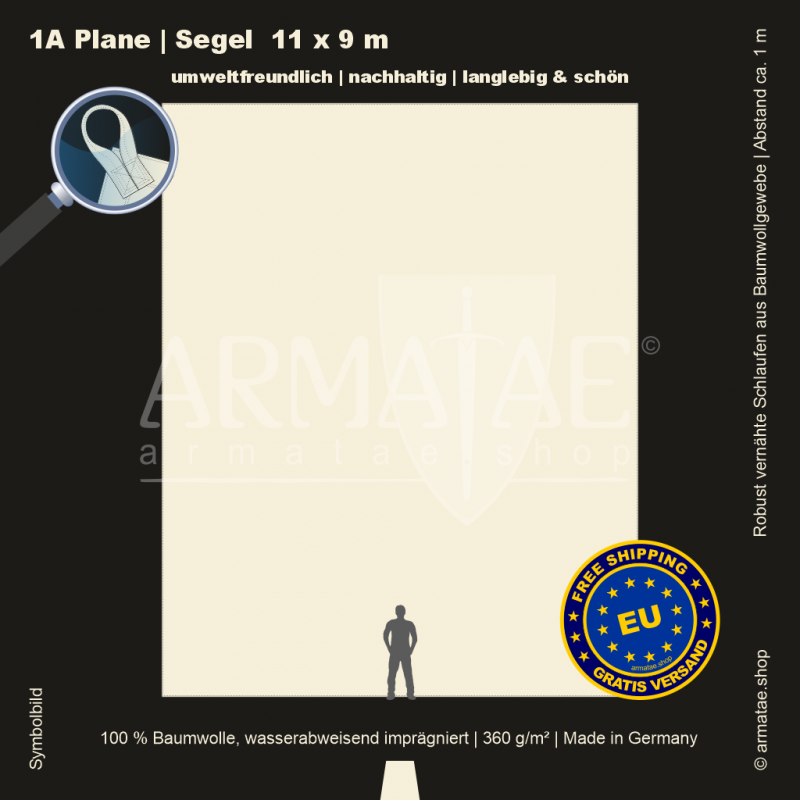 Schwere Sonnenschutz & Regenschutz Plane aus wasserabweisend imprägniertem 100 % Baumwollgewebe mit 360g/m². Für unzählige Einsatzbereiche, ob mobil oder für den Dauereinsatz fest montiert. Umlaufend gesäumt und mit Schlaufen aus Planenmaterial im Abstand von 1 m von Hand gefertigt. 5 Jahre Garantie auf die äußerst robuste Verarbeitung.