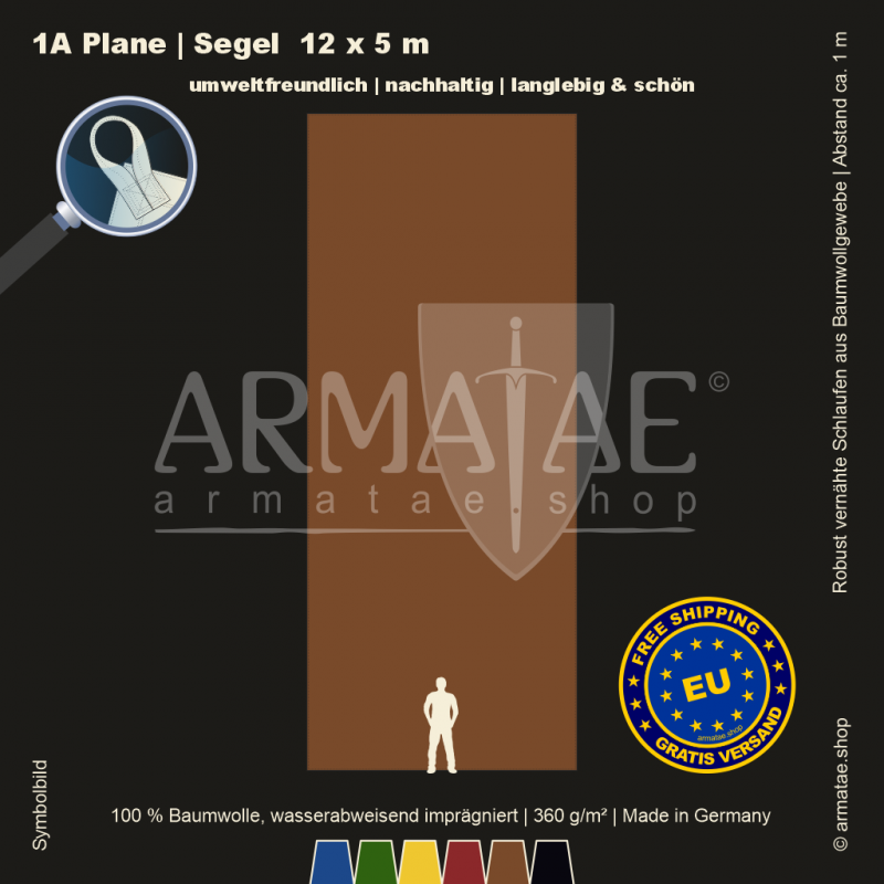 Schwere Sonnenschutz & Regenschutz Plane aus wasserabweisend imprägniertem 100 % Baumwollgewebe mit 360g/m². Für unzählige Einsatzbereiche, ob mobil oder für den Dauereinsatz fest montiert. Umlaufend gesäumt und mit Schlaufen aus Planenmaterial im Abstand von 1 m von Hand gefertigt. 5 Jahre Garantie auf die äußerst robuste Verarbeitung.