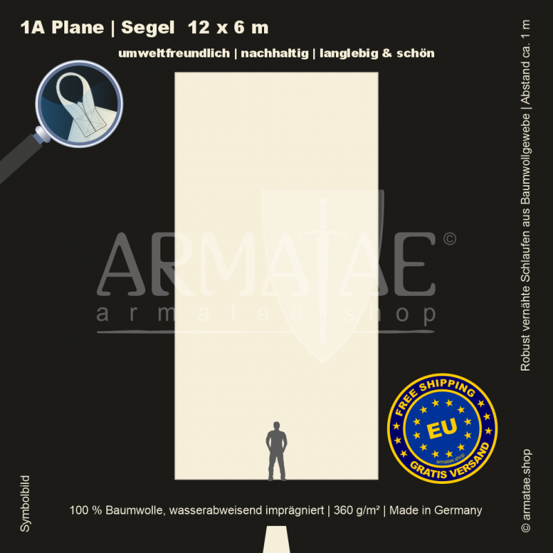 Schwere Sonnenschutz & Regenschutz Plane aus wasserabweisend imprägniertem 100 % Baumwollgewebe mit 360g/m². Für unzählige Einsatzbereiche, ob mobil oder für den Dauereinsatz fest montiert. Umlaufend gesäumt und mit Schlaufen aus Planenmaterial im Abstand von 1 m von Hand gefertigt. 5 Jahre Garantie auf die äußerst robuste Verarbeitung.