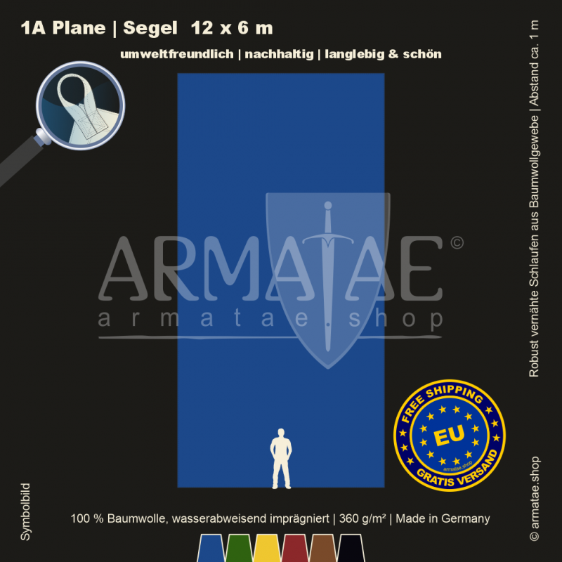 Schwere Sonnenschutz & Regenschutz Plane aus wasserabweisend imprägniertem 100 % Baumwollgewebe mit 360g/m². Für unzählige Einsatzbereiche, ob mobil oder für den Dauereinsatz fest montiert. Umlaufend gesäumt und mit Schlaufen aus Planenmaterial im Abstand von 1 m von Hand gefertigt. 5 Jahre Garantie auf die äußerst robuste Verarbeitung.