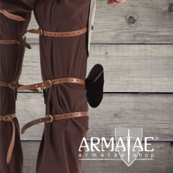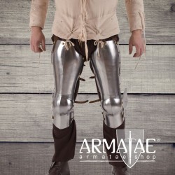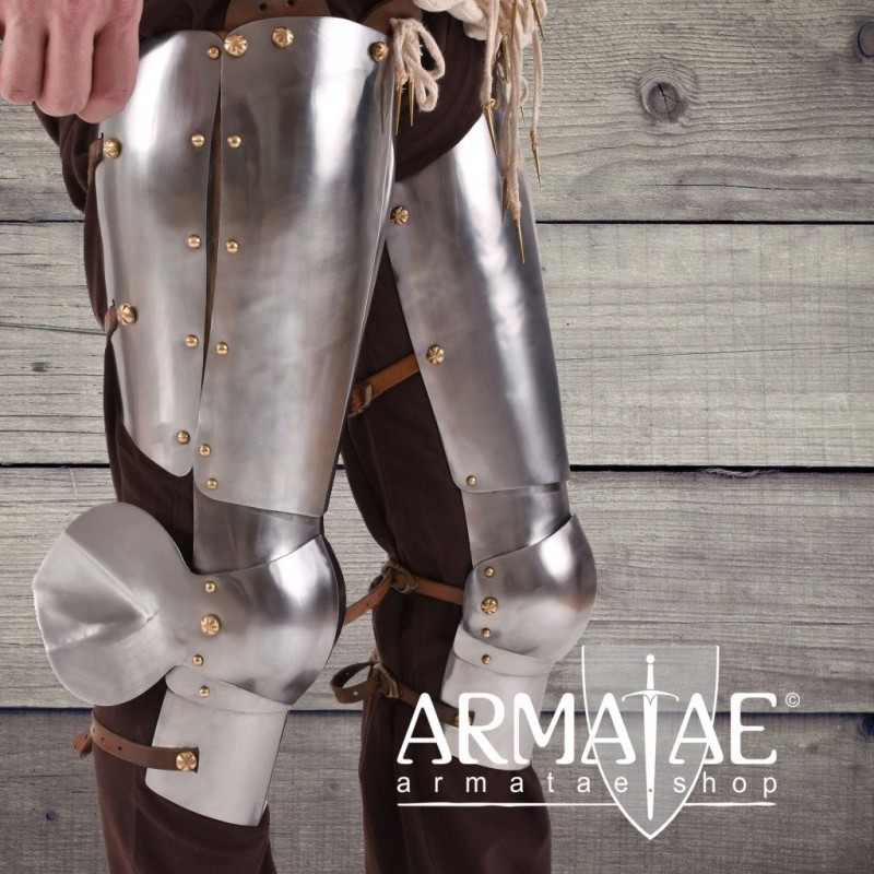 Aufgebaut mit einem einfach geschobenen Diechling, Kniebuckel und zweifach geschobenem Beinröhren. Am oberen Rand sind Lederstücke mit Nestellöcher aufgenietet. Rückseitig finden sich jeweils 4 Lederriemen mit authentischen Schnallen aus massivem Messing für eine individuelle Anpassung und einem festen Sitz.