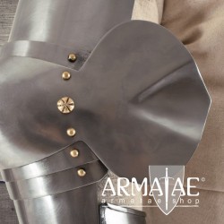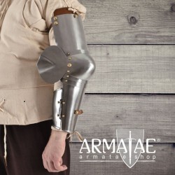 Rein von Hand gefertigte, formvollendete Rekonstruktion eines spätmittelalterlichen Armzeugs. Bestehend aus jeweils 2 mit massiven Scharnieren verbundenen Unterarmröhren an Geschübe mit Ellbogenkachel und einer halben Oberarmröhre mit angenieteten Lederflecken sowie jeweils 3 aufgenieteten Lederriemen mit authentischen Messingschnallen ist dieses hochwertige Armzeug voll beweglich.