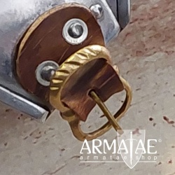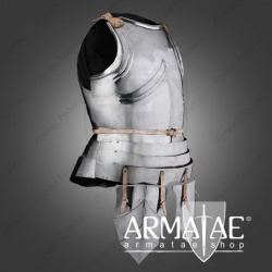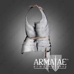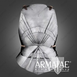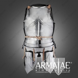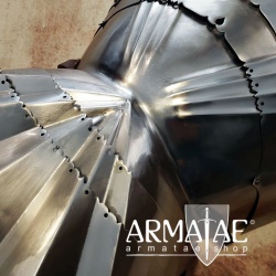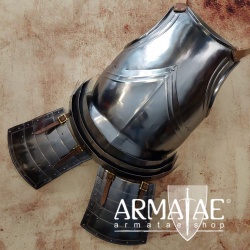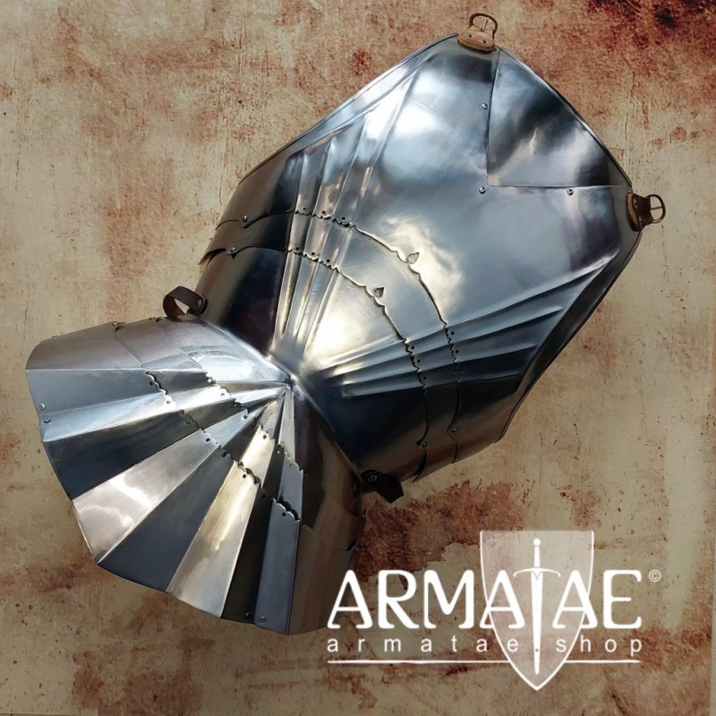 Hergestellt aus 1,2 mm starkem Stahlblech ist der aus in Summe elf Teilen bestehende und aufwendig von Hand gearbeitete Brustpanzer (exkl. Beintaschen) überraschend leicht, bietet ein hohes Maß an Bewegungsfreiheit und lässt sich durch die Befestigungsart sehr individuell an die Körpergröße (max. 190 cm) anpassen.