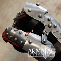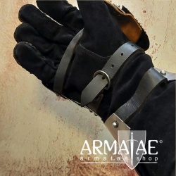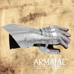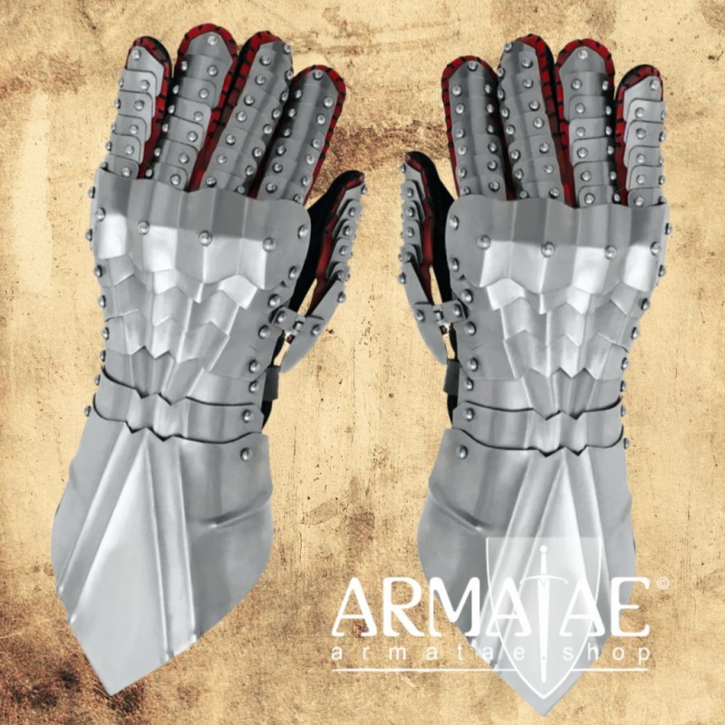 Mit den schuppenartig angelegten Platten und per Scharnier verbundenem Daumenelement an den hochwertigen und fest mit den Platten vernähten Lederhandschuhen genießt man bei diesen Plattenhandschuhen ein hohes Maß an Bewegungsfreiheit, ohne schmerzhafte Druckstellen beim Halten einer Lanze oder eines Schwertes etc.