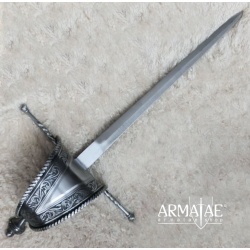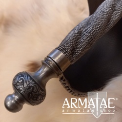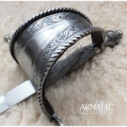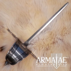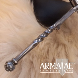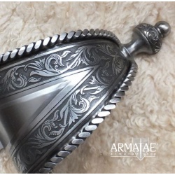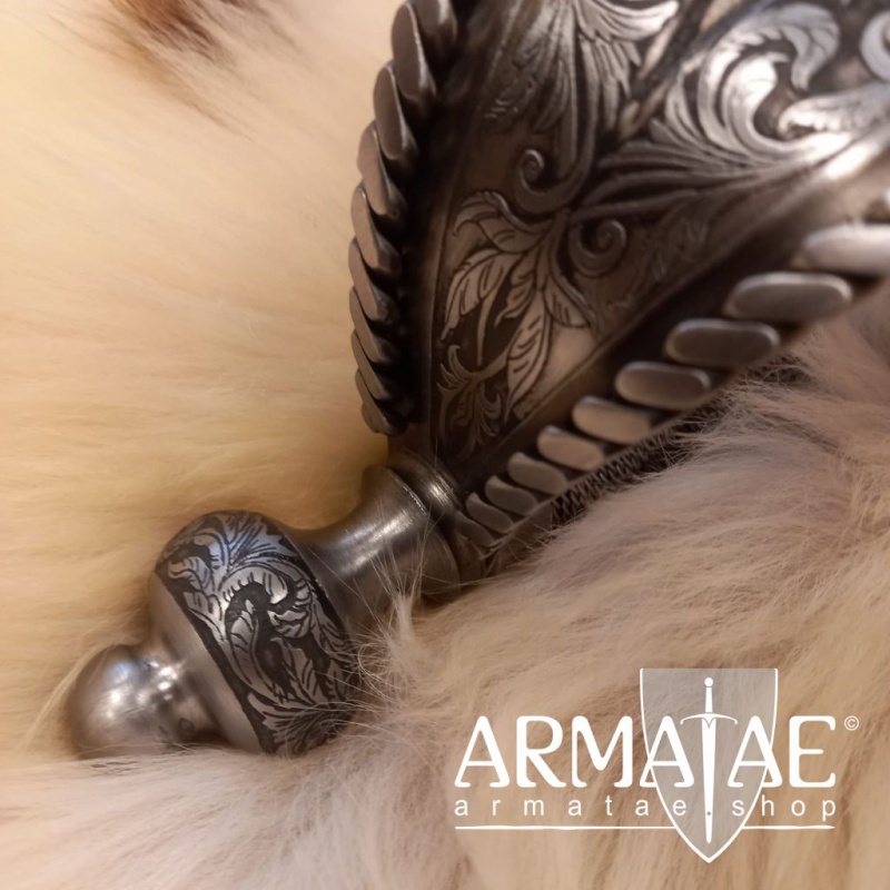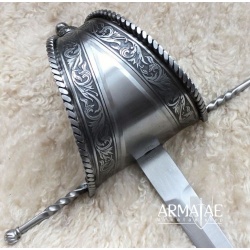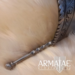 Elitär gediegen präsentiert sich dieser spanische Dolch mit den wunderschönen sowie authentischen Ätzungen am Gefäß und am Knauf. Alleine die tordierte Parierstange mit den fein geschmiedeten Abschlüssen bildet eine Augenweide für sich. Aber mit Schönheit alleine wird man auf lange Sicht nicht glücklich werden, daher wurde auch die klassische Klinge aus hochwertigem 54SiCr6 Federstahl gefertigt, welche auch härtesten Schaukämpfen über viele Jahre trotzen wird.