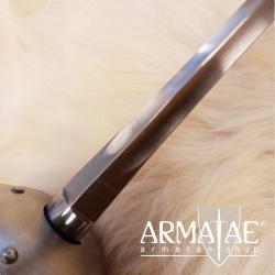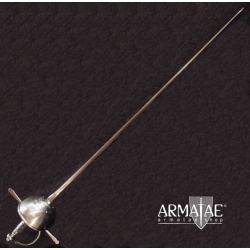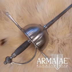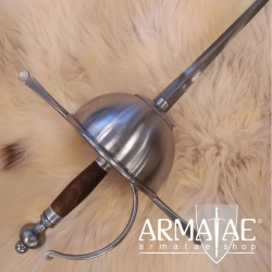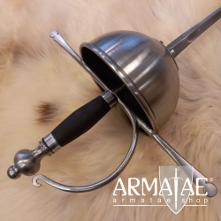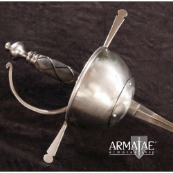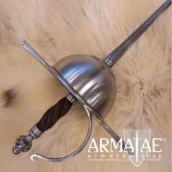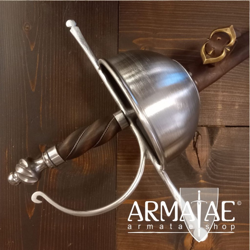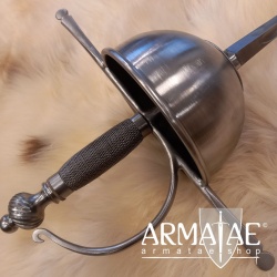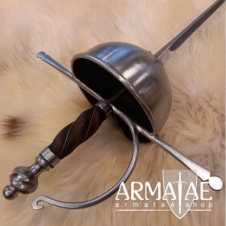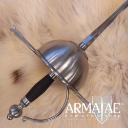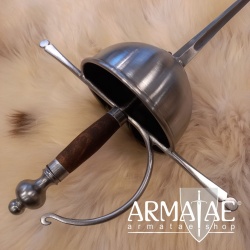 Ein spanischer Glockenrapier mit Fingerschutz in sehr robuster, schlichter Ausführung, ideal für die Fechtschule. Die authentische Optik der Einheit lässt diesen Rapier aber auch an historischer Gewandung, beim Schaukampf oder auf der Bühne glänzen.