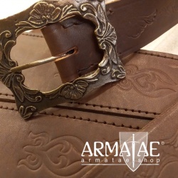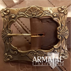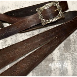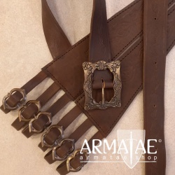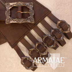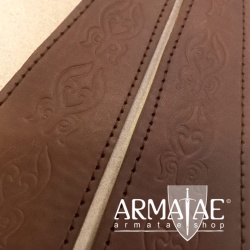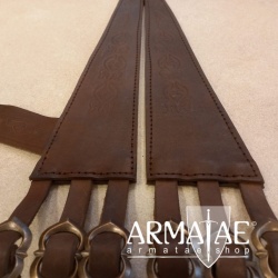Das gesamte Gehänge ist aus bestem Rinds-Kernleder doppelt ausgeführt, verklebt und umlaufend in Sattler-Qualität vernäht. Dadurch erreicht das Bandelier eine sehr hohe Festigkeit, damit beim Gehen der Rapier nicht störend hin & her wackelt.